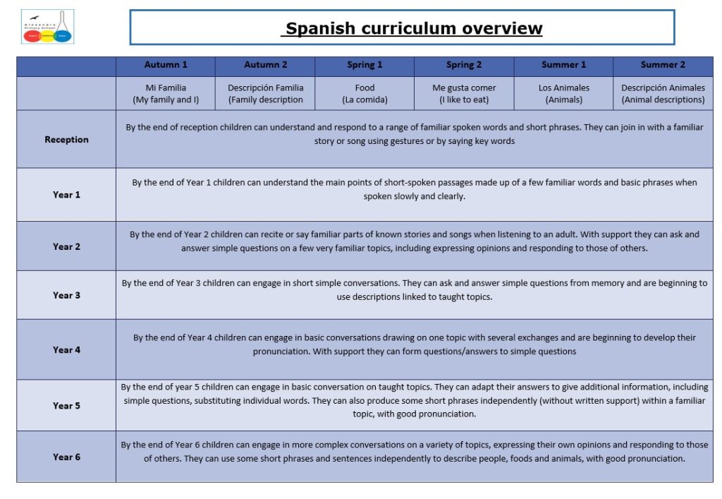 Pupils participate in a weekly lesson of 30 minutes, delivered by our HLTA and native speaker Ruth de la Cruz. The lessons involve a variety of engaging approaches to teaching and learning, including speaking and listening activities, lots of opportunities to role play to consolidate new learning through a variety of authentic material to ensure all pupils are fully engaged. Year 3-6 also do some writing.